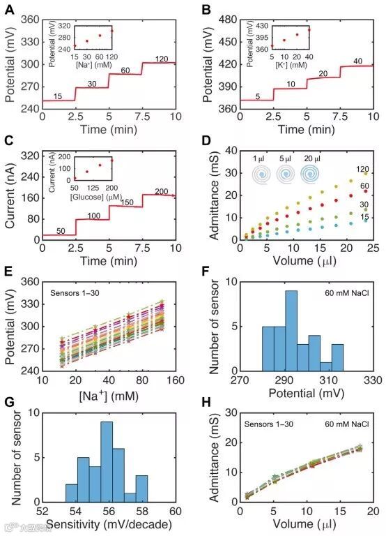 在印刷Ag / C电极上功能化的(A)Na +,(B)K +和(C)葡萄糖传感器后的性能。(D)在15至120 mM NaCl溶液中,Ag汗液速率电极上,微流体通道中包含的流体体积与导纳之间的关系。(E)30个 Na +传感器的校准曲线。(F)在60 mM NaCl溶液中,30个 Na +传感器开路电压的变化。(G)60 mM NaCl溶液中,30个传感器灵敏度的变化(H)30个汗液速率传感器性能的变化。
