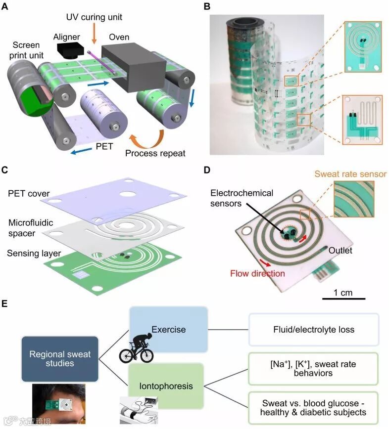 (A)可穿戴生物传感贴片的R2R旋转丝网印刷。(B)通过R2R处理印刷的传感电极图案的照片。(C)通过组合传感层,微流体粘合间隔物和PET覆盖片来组装生物传感贴片。(D)组装的生物传感贴片包括在收集容器内的电化学传感器和嵌入微流体通道中的电汗液速率传感器。(E)连接到印刷电路板(PCB)的贴片可以佩戴在身体的各个部位,用于区域研究运动和离子电渗疗法汗液成分和动态。