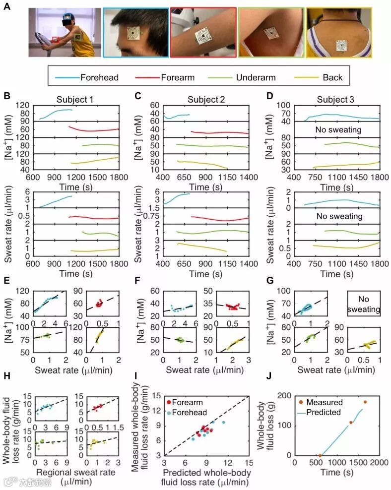(A)在检测者的前额、前臂、腋下和背部分别佩戴生物传感贴片,并同时监测这些位置的汗液参数。测量对象1(B)、对象2(C)、对象3(D)汗液中[Na+]和出汗速率随时间的变化图。测量汗液中[Na + ]与对象1,2和3的出汗率之间的关系(E),(F)和(G)。(H)对象1的全身失水率与区域出汗率之间的关系,在前额和前臂出现强烈的正相关关系。(I)测量和预测的对象1在离散时间的全身失水率接近1:1。(J)从前额出汗速率实时预测全身失水率。