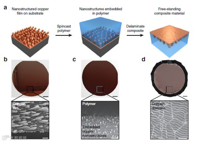 首先,通过两步斜角沉积工艺用电子束将红外反射的纳米铜膜蒸发到支撑基板上,从底层连续的金属(铜)涂层中获得排列倾斜的纳米柱。之后,将红外透明的苯乙烯-乙烯-丁烯-苯乙烯(SEBS)共聚物直接涂在纳米结构金属层上,稳定地锚定该弹性体内的铜柱。最后,对支撑基板产生的复合材料进行热处理和分层,得到了独立的复合材料。
