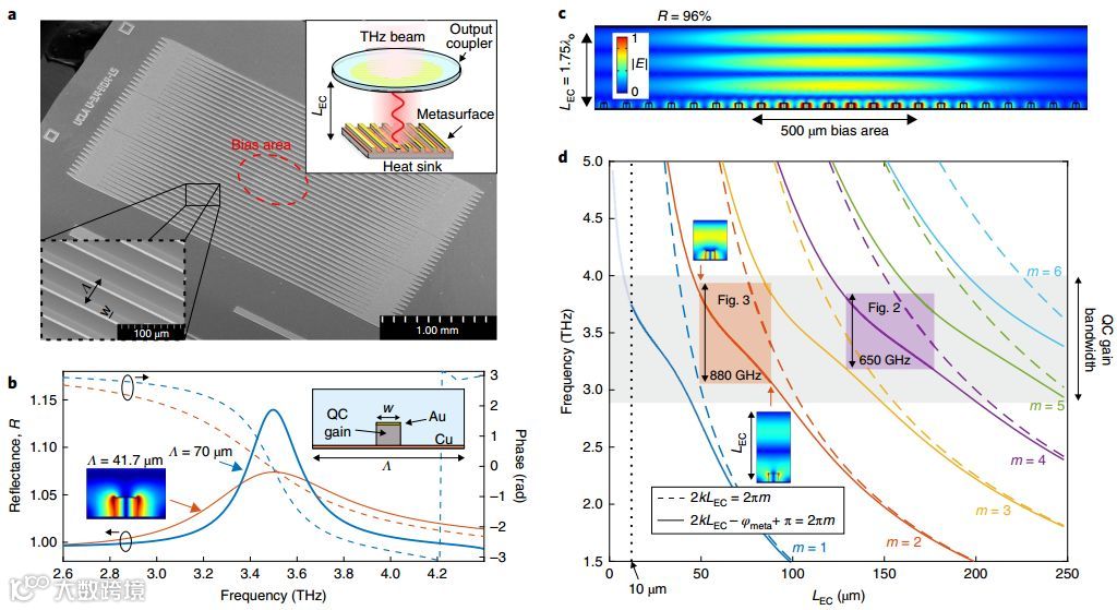 宽调谐范围的单模激光光源具有广泛的应用前景,包括宽带光谱学、频率灵敏外差接收机和光学相干层析成像等。尽管有各种各样的优化激光光谱调谐技术,但一直没有取得突破性的进展。我们知道,改变激光腔的长度是一种简单的连续调谐激光波长的技术,但除了垂直腔面发射激光器(VCSEL),却很少用于宽分数调谐。这是因为,为了避免模跳,腔必须要短,以确保相比于高增益带宽的材料而言有一个大的自由光谱范围。太赫兹的量子级联激光器是这种短腔结构的理想候选器件,因为它们具有优越的增益带宽,并且可以与宽带放大超表面集成。