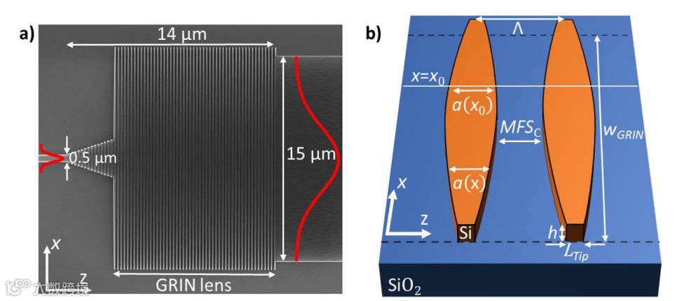 光学渐变折射率(GRIN)材料能够应用于光准直、波导交叉、多模波导弯曲或光学隐形等方面,因而引起了人们越来越多的关注。渐变折射率材料可以通过复杂的灰度光刻或通过使用亚波长光栅(SWG)来实现。亚波长光栅是一种周期性介电结构,其周期小于通过它传播的波长,从而可以使用单个蚀刻步骤加工具有可控等效折射率的超材料。高性能SWG已经在硅绝缘体(SOI)平台上成功实现,包括集成生物传感器、超宽带波导耦合器和窄带布拉格滤波器等。这种均匀的SWG的各向异性最近已被用来实现更先进的功能,例如宽带、倏逝场调控和高性能偏振调控。但是,在梯度指数超材料中,这种固有各向异性的优势仍未得到充分的研究。