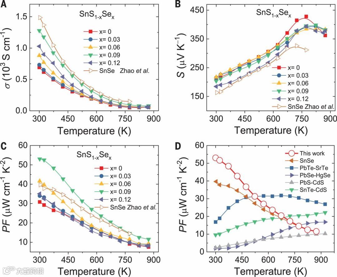对于给定的热电材料,操纵电子能带结构需要优化无量纲品质因数(β),β∝(m *)3 /2μ,其中m *和μ分别为有效质量和载流子迁移率。众所周知,两波段会聚和发散相反,对于热电材料,m *和μ的行为通常是反相关的,协同优化它们具有挑战性。在这项研究中,北京航空航天大学赵立东教授团队采用温度梯度法和2%的Na掺杂合成了SnS1-xSex晶体。在SnS0.91Se0.09晶体中,300 K下实现功率因数从30 μW/(cm•K2)提高到53 μW/(cm•K2),同时降低了Se合金化后的导热系数;873 K时获得了最高品质因数ZTmax为1.6,在300至873 K间获得的平均ZT值为1.25。他们研究了三个独立电子带的温度依赖性演化和相互作用,涉及两带会聚,两带发散和两带交叉的相互作用。随着温度的升高,三个相互影响的频段变得更加清晰。通过密度泛函理论(DFT)计算和角度分辨光发射光谱(ARPES)测量证实了谱带相互作用。将S替换为Se,可以促进三个独立的电子带的相互作用,从而成功优化m *和μ。该频带操纵策略为优化热电性能提供了另一条途径,高性能SnS晶体为向低成本、环保热电迈出了重要一步。该工作于近日发表在《Science》上。