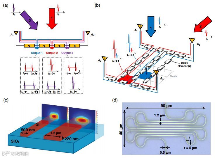 近日,来自宾夕法尼亚大学的研究团队报导了第一台集成纳米光子近场成像器,研究人员使用UWB天线接收来自目标物体的反射宽带微波信号,并使用电光环形调制器将其变频到光域。使用光学延迟线并结合11×11光电二极管矩阵进行光检测,从而进一步放大光电流并检测能量,以形成目标物体的近场图像。利用先进的金属堆叠工艺,光子延迟线的芯片面积比同类等效电子延迟线面积减小约44倍,并且其传输损耗要低16倍以上。此外,光子延迟线及相关装置在微波状态下不受杂散信号磁耦合和电磁干扰的影响。该成像器芯片能够同时接收121条光束,其延迟分辨率为9.8 ps,能够用于形成不同物体的近场图像。