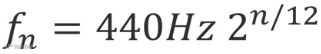 这个图里横坐标是时间,纵坐标是频率。我们可以看到,钢琴的声音在谱图上构成了几条完美平滑的指数曲线。我小时候总问一个音符的频率是多少赫兹,十二平均律给了我们一个非常简单的公式,从音符A数,第n个音符的频率为: