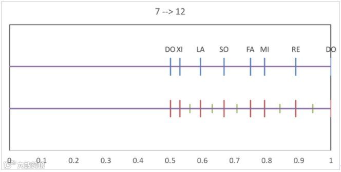 “七个音的位置画出来了,显然这些音之间的间隔是不均匀的,有的宽有的窄。”珍旭班长说:“看看这样的不均匀,大家有木有冲动,想在这些音中间插入新的音符呢?如果我们在比较宽的间隔中插入一个音,就会得到十二个音,它们的间距也会显得比较均匀了。这有点像是在钢琴的七个白键之间,插入五个黑键。”