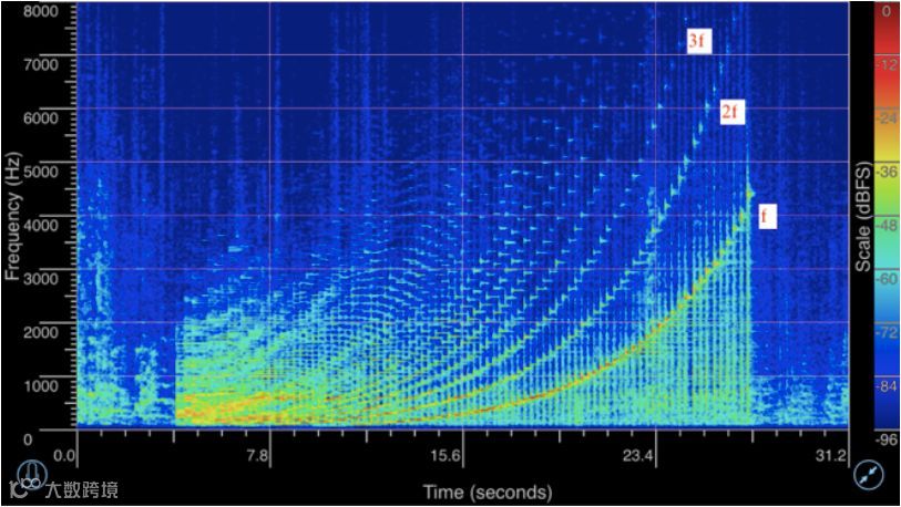 从图里我们看到,每次按下钢琴的一个键,都会产生基频和二次三次等倍频,基频和每个倍频都分别构成一条完美平滑的指数曲线。如果钢琴不是按十二平均律调出来的,这些曲线就会多少显得有点坑坑洼洼的。