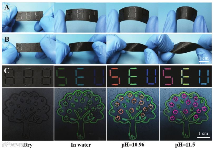 图三:有图案的柔性纳米薄膜受溶液pH值控制显示加密的颜色信息