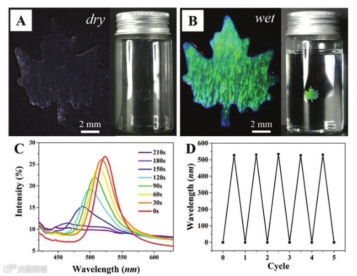 这类柔性纳米粒子具有较低的玻璃化转变温度和核-壳结构,因此在室温干燥条件下可发生部分变形并相互融合,制备得到的柔性薄膜不仅可以实时控制所设计颜色、图形等信息的隐藏与显示,而且可以对溶剂、酸碱度、应力等外界刺激作出可逆响应。