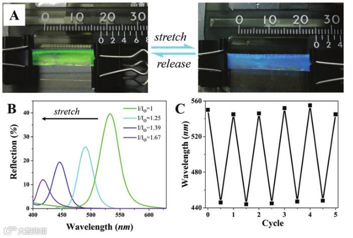 图一:从完全浸透到完全干燥状态的过程中记录的共聚物膜的反射光谱及颜色变化