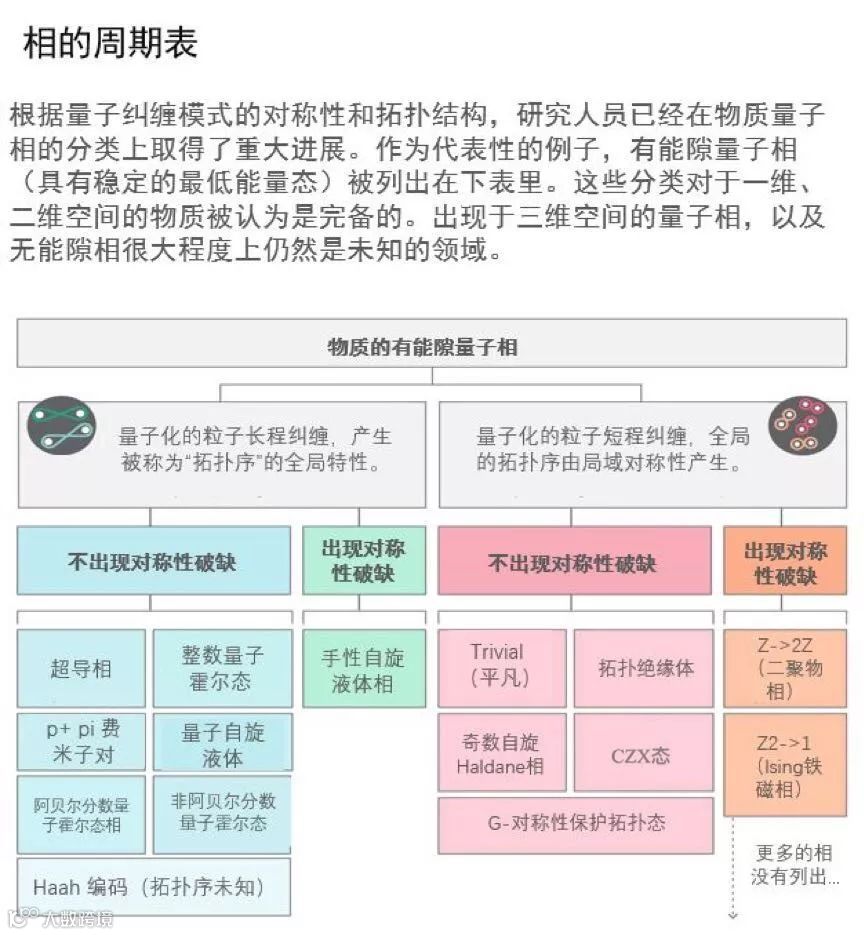在众多理论物理学家的带领下,加上数学家的贡献,研究人员已将大量一维或二维空间中可能出现的“有能隙”物相进行了分类,方法是将物质与其量子纠缠结构(也被称之为量子拓扑结构)联系起来。(量子拓扑结构被张量范畴学这一近代数学分支所描写。)他们也开始探索在接近绝对零度时,三维物质可能出现的物相,这是目前研究中的空白地带。(编者按:最近兰天、孔良、文小刚在这方面取得了突破性进展。)