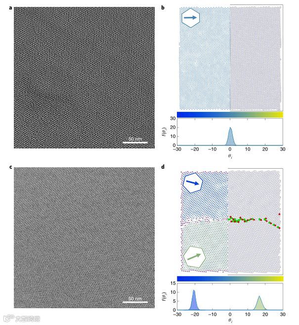 b、d分别为a和c中样品的voronoi映射(右)和六阶参数映射(左)。