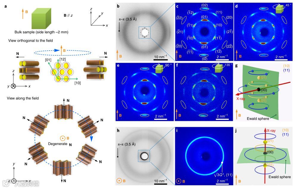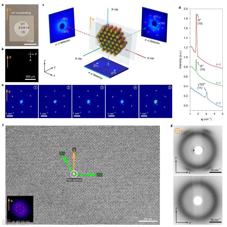 实验首次探索了磁场定向自组装方法,在6T静态磁场下,以0.2°C min−1的速率将样品从各向同性状态缓慢冷却到室温。