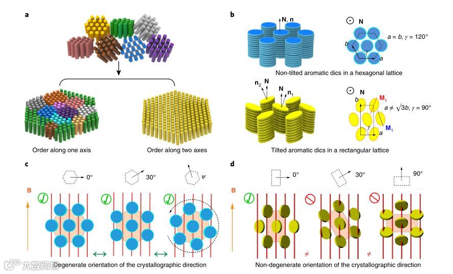 简并度可随样品绕垂直场的轴旋转而改变。这种旋转限制了与旋转轴平行的硬轴(即柱状轴)。然而,六方晶格仍保持简并则是因为场只指定了柱轴的方向,并不指定它们的六方晶格矢量的方向(图1C)。因此要实现对晶格矢量的控制,就需要打破柱状矢量的连续旋转对称性。