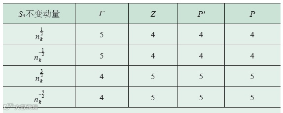 表3 AgNaO价带在S4本征值中的占据数,其中nkjz 中jz = 1/2,- 1/2, 3/2, - 3/2用来标记S4本征值, exp(-ijzπ/2) 。Γ=(0,0,0),Z=(0,0,1),P' =(0,1,-1/2),P=(0,1,1/2),为4 个S4不变动量的坐标(在惯用元胞对应的倒空间基矢下)