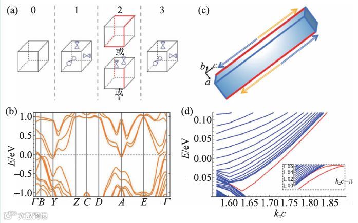 为了验证上述高阶绝缘体特有的“体—边”对应,我们构建了同时具有空间反演和螺旋对称的棱柱(图6(c)),并且计算了棱柱的电子结构,如图6(d)所示,根据波函数实空间的分布区分出来铰链态,在图6(d)中以红线表示(两个helical 的铰链态在棱柱中的具体位置见图6(c)。值得提及的是,这里的结果被Wang等人的工作证实[101]。