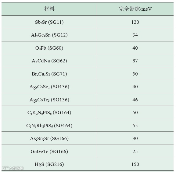 表4 我们预言的一些具有较大能隙(≥25 meV)的拓扑绝缘体材料,在“材料”列中,每一个化学式后面给出了所在的空间群