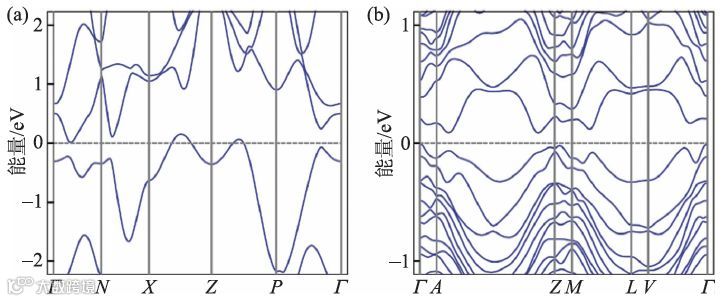 图8 (a) 拓扑绝缘体Ag2Zr(SG139) 的电子能带结构;(b) 拓扑绝缘体Ba11Cd14Bi8(SG12)的电子能带结构