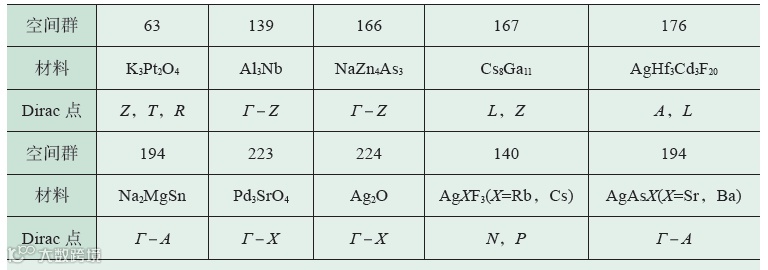 表5 一些费米面比较干净且Dirac 点离费米面较近的Dirac 材料[91,104],这里除了给出空间群(SG)信息、材料化学式,还给出了Dirac 点的位置(它们可以在高对称点上,比如K3Pt2O4的Z,T,R 上,或者高对称线上,比如Al3Nb的Γ-Z线上)