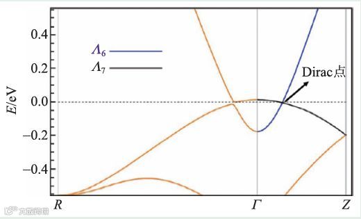 图11 Dirac 半金属MgBi2O6(SG136)的电子结构,其中箭头标记Dirac 点, Λ6 和Λ7 标记高对称线Γ - Z 上两个不同不可约表示