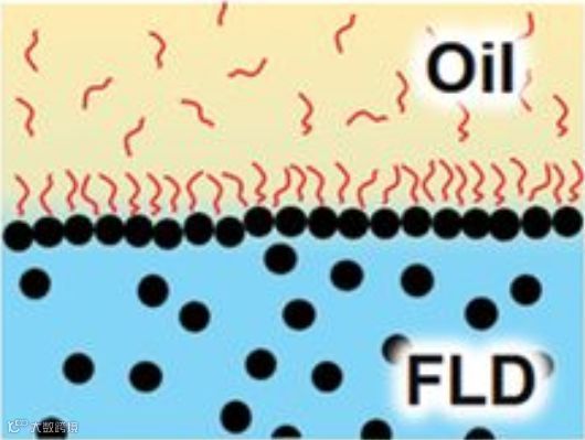 在水油界面,自组装形成的纳米颗粒-表面活性剂会挤满整个界面。图中上半部分表示油相,下半部分表示铁磁液滴(FLD);红色曲线表示表面活性剂 POSS-NH2,黑点表示磁性纳米颗粒 | 图片来源:[1]