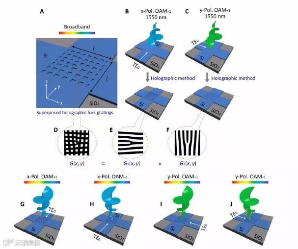 来自华中科技大学与中山大学团队合作提出了在硅波导的顶部引入亚波长表面结构(叠加全息光栅),将平面波导模式以及外部的自由空间OAM模式耦合,在理论以及实验上证明了1500nm到1630nm的宽带多极化轨道角动量模式的生成,具有高纯度以及效率。这种超紧凑宽带多极化OAM发生器为实现N维光复用通信,接口连接,高维量子通信系统开辟了新的视角。相关文章发表于杂志《Science Advances》上。
