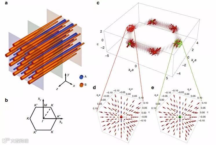 近日,来自英国伯明翰大学的研究团队在光子晶体中构造出了人工Weyl点,该光子晶体由沿着传播方向具有渐变半径的蜂窝阵列的耦合杆组成。该系统在两个动量的合成空间中具有光子Weyl点加上另外的物理参数,其具有由Weyl点附近的大Berry曲率产生的增强的霍尔效应。有趣的是,当波包非常靠近Weyl点时,观察到螺旋Zitterbewegung(ZB),这归因于由近似简并本征态导致的非阿贝尔Berry connection。