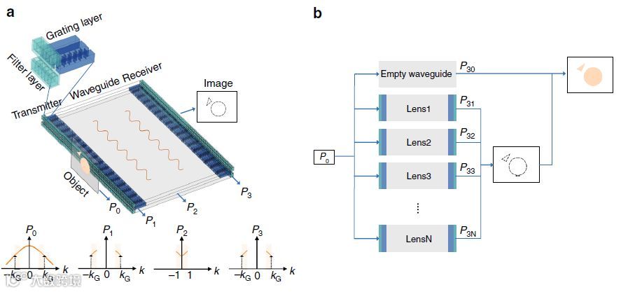 上图是系统示意图和系统的工作流程,一共分为四步。第一步是使用亚波长谐振器阵列(表示为滤波器层)放大选定的亚波长空间频率;第二步是使用二元相位栅(表示为栅极层)来消除入射行波分量并把入射的倏逝波分量转换为行波。这两步的结构构成系统的发送器,并建立亚波长倏逝波与行波之间一一对应的关系。在这个过程中我们并不直接测量转换的行波,而是使用对称结构把自由空间传播的行波再次转换成倏逝波;第三步和第四步正好与第二,第一步相反。