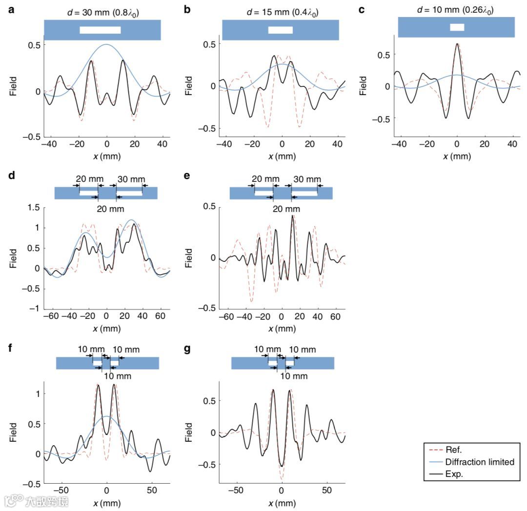 一维单缝和双缝的亚波长成像和边缘成像。图a-c分别为30 mm(a)、15 mm(b)和10 mm(c)的单个狭缝的边缘图像。d是具有20 mm和30 mm狭缝宽度和20 mm边到边距离的双狭缝物体的形貌图像。e 是20-30 mm双缝的边缘图像。F是具有10 mm和10 mm狭缝宽度和10 mm边到边距离的双狭缝物体的形貌图像。g是10–10 mm双缝的边缘图像。在(a-g)中,黑色实线是实验测量,蓝色实线是空波导的衍射极限结果,红色虚线是理论参考。