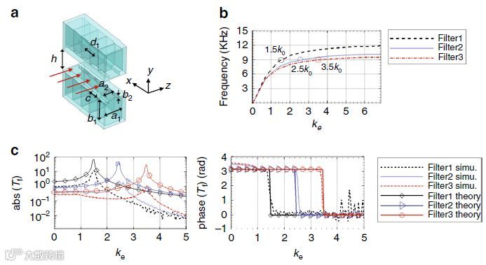 图b三条理论计算的曲线对应的频率是f0=9000 Hz,分别有a1=4.5mm,ke=1.5 (filter1);a1=6mm,ke=2.5(filter2);a1=6.5 mm,ke=3.5 (filter3)。图c是三个滤波层理论计算和模拟的振幅和相位的传递系数。