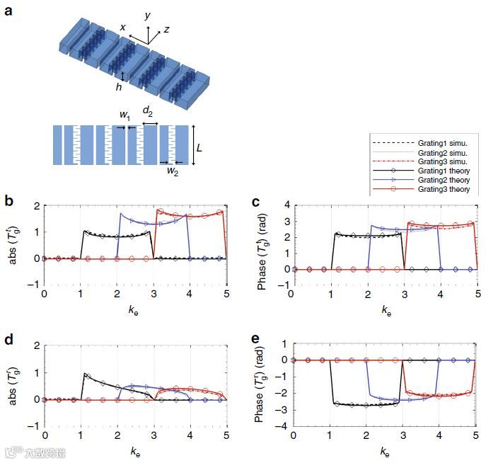 图a是栅极层的几何参数为:w1=1.25mm,w2=6.95mm,L=18.75mm通过改变栅极周期d2将得到不同的KG。选择d2=18.9mm作为KG=2k0(格栅1),d2=12.6mm作为KG=2k0(格栅2),以及d2=9.4mm,对于KG=4k0(格栅3)。图b和c分别对应发射极振幅b和相位c在栅极层理论和模拟的传递系数系数,d和e对应的是接收极。