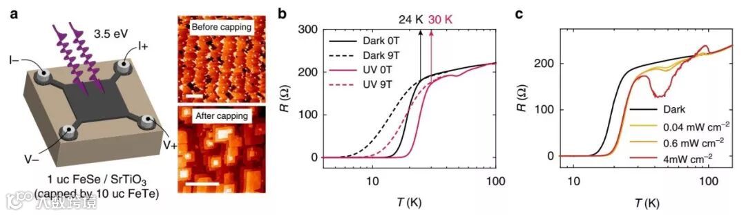 超导的光学控制一直是许多研究工作的焦点,但缺乏相关的实验验证。迄今为止,仅在离子液体门控有机材料(ionic liquid-gated organic materials)中证明了对连续波(continuous-wave, CW)光产生的超导性的持续影响。而对于有源量子器件应用来说,非常需要通过光控超导的能力。由于超导体很少表现出强烈的光响应,而且光敏材料通常不是超导的,因此在单一材料中,这两个特性之间的有效耦合非常具有挑战性。近期,来自美国西弗吉尼亚大学的研究团队探索了一种不同的策略,通过光学调控外延异质结构FeSe/SrTiO3中的超导性。实验证明,短时间暴露于弱3.5 eV 连续波紫外光可以提高FeSe / SrTiO3异质结构中的超导转变温度,并产生零阻抗状态,在黑暗中至少持续数天。作者将这种效应归因于SrTiO3中的强光载流子- 声子耦合(photocarrier-phonon coupling)以及在FeSe / SrTiO3界面处产生的亚稳极性晶格畸变。通过紫外光激发和场控制的界面偶极子重定向可以实现这种亚稳态和基态之间的快速非易失性转换,使得对量子材料的主动操作成为可能。此外FeSe / SrTiO3异质结构还表现出非常大的光电压和光电容,这是界面效应的结果,显示出在光电应用中由3D氧化物和2D层状材料实现设计的异质结构的潜力。相关研究发表在近期的《Nature Communications》杂志上。
