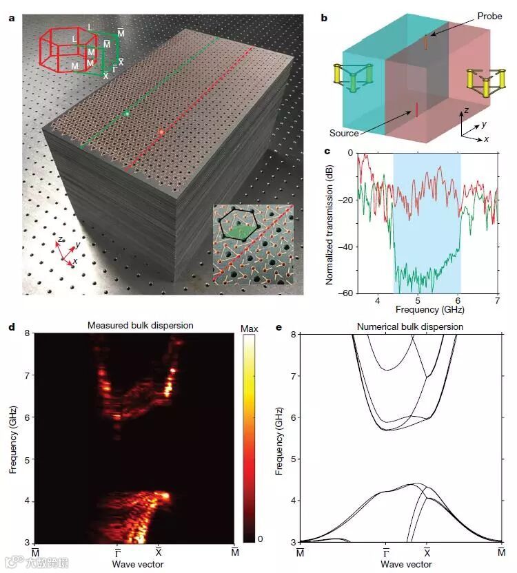实验中,在铁氟龙玻璃编织包铜压层板(Teflonwoven glass fabric copper-clad laminate)背景中放置SRR,通过调节SRR的z方向的长度,可以实现宽禁带结构的连续变化。z方向的反射对称性的破坏,会引入双各项异性(bi-anisotropic)耦合,起到类似Kane-Mele 自旋轨道耦合(SOC)作用。实验将两种不同拓扑类型的结构拼接在一起,测量了沿着畴壁的透射谱,发现即使在体带的禁带频率区域,边界态仍然具有高的透射率,证实了拓扑绝缘体的体-边界对应效应。实验还测量了表面狄拉克锥,演示了边界态的鲁棒性,结果得到了数值模拟的相互印证。相关研究成果发表在近期的《Nature》上。