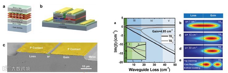 光学激光器的研究具有悠久的历史,它具有高能量、高相干性、高可控性等等优点,是光学研究中必不可少的器件。在光学激光器中,人们关心能量的输出效率,因而往往将研究方向集中在光学增益中,而将激光中的光学损耗视为有害的、需要尽量避免的。然而在最近的研究中,时空(PT)对称性提供了一种独特的途径,通过在激光腔内同时调控增益和损耗,能够实现传统激光所不具备的奇特性质,比如位于时空对称奇异点的单模现象。近日,来自马萨诸塞大学洛厄尔分校的Wei Guo教授及其团队报告了一项新的研究成果。不同于以往利用光学注入的方式调控时空对称激光,他们设计了一种基于电注入的耦合波导PT对称激光器。与光学注入的PT对称激光器相比,这种电调谐的方式能够更有效的对激光腔中的增益和损耗进行动态调制。通过数值分析并计算PT对称波导的模式,能够计算出PT对称至PT破缺的几个不同阶段,并且通过实验观察到相应的PT对称腔模式,并最终展示了由PT对称模式选择实现的电注入单横模宽区域耦合波导激光器。目前,在高功率激光器和锥形放大器(TA)二极管中,必须使用大面积、单模波导。然而,以往的传统设计往往伴随着激光器性能下降、高输出功率下单模的不稳定性,以及由于锥形波导形状而导致的额外制造复杂性。在这种情况下,PT对称性提供了一种独特的途径,能够在不牺牲激光器性能的前提下操纵激光腔模式并实现单横模操作。因而,这种基于电注入的时空对称单模激光具有广泛的应用前景。