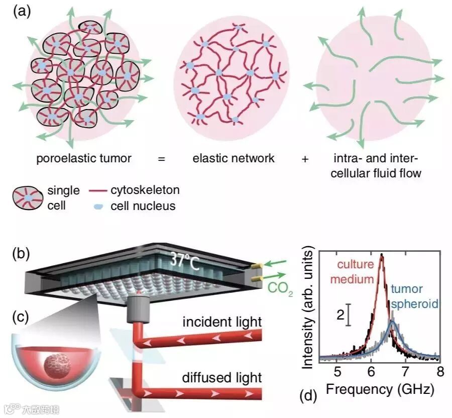 (a)成孔细胞瘤的力学结构图。每个细胞的细胞骨架连接在一起形成一个弹性网络。这个网络被细胞内和细胞间的液体侵入,这些液体被声音振动所驱动。(b)装置示意图。激光束送入标准生命科学显微镜。电动台驱动96孔板作样本扫描,将漫射光收集并发送到分光计。(c)单孔放大图,每孔都充满培养基,并含有一个实体瘤球。(d)在培养基(黑线)和肿瘤球体(灰线)中获得的典型光谱。分别用红色和蓝色绘制拟合的曲线。