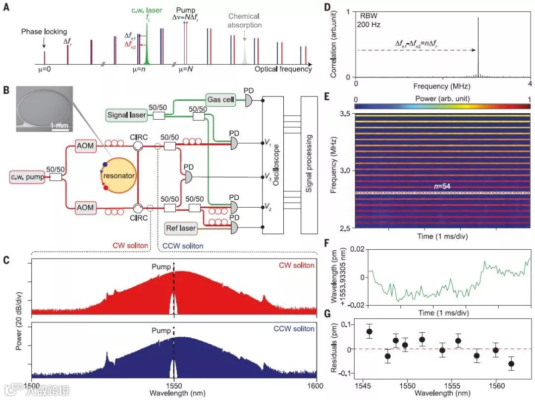 在该工作中,研究人员基于反向传播的孤子光梳,展示了一种宽带,高速,高分辨率的微型游标光谱仪(microresonator soliton spectrometer, MSS)。孤子光梳是一类通过克尔效应在高品质因子的光学微腔中实现的锁模光频梳。相较于传统的光频梳,孤子光梳具有体积小、造价低和可集成等优点。在之前的研究中,人们发现,通过同时在顺时针和逆时针方向泵浦微腔,可以产生一对独立可控的孤子光梳。不仅如此,它们之间还可以非常容易地实现相位锁定,从而大大增强每对梳齿频率的相对稳定性,并大幅提升游标光谱仪的精度。