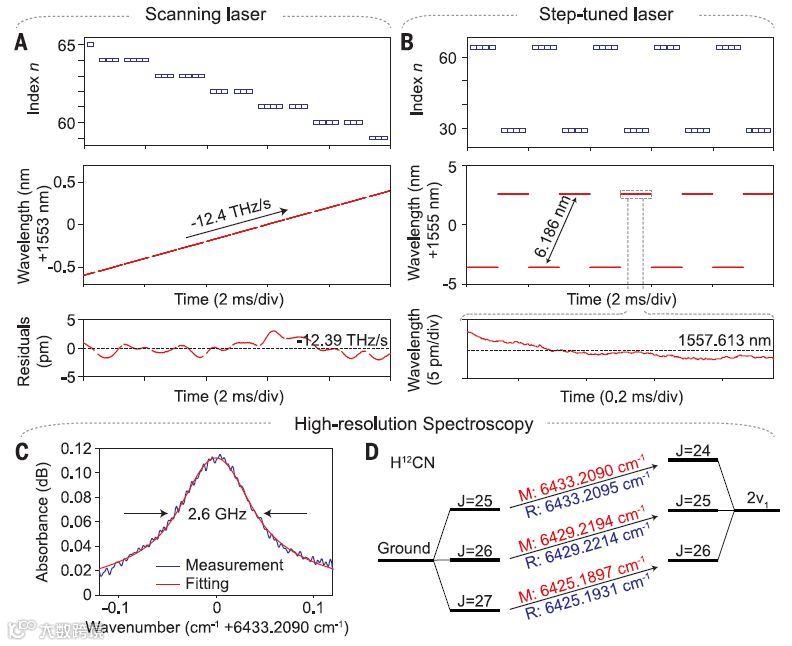 利用该微型游标光谱仪,研究人员首先测量了一系列固定激光的频率,并与波长计进行了比对,两者相对偏差不超过0.1 pm。研究人员还对快速扫频的激光器进行了实时测量,不仅精确测定了超过10 THz/s的扫频速度,并且可以分辨非线性、非连续的扫频过程。利用扫频激光器,研究人员还测量了氰化氢分子的吸收谱,并使用微型游标光谱仪对测量结果进行了校准,使得其与参考值的吻合度达到了小数点后6位以上。