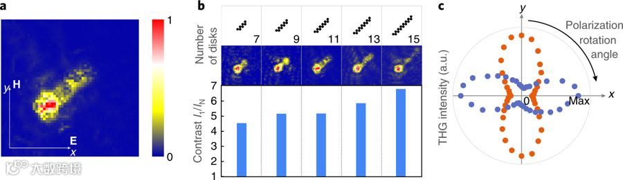 a.11号z字纳米阵列磁盘产生的三次谐波场的分布b.不同长度的Z字阵列的THG强度的对比c.根据顶部谐振器(红色)和底部谐振器(蓝色)的THG在15号z字纳米盘中的亮度,作出偏振角相对于x轴的函数图象。