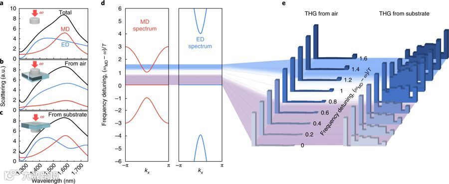 a-c.在空气(a)中或在诱导磁电耦合的基板(b,c)上的隔离纳米级谐振器。 d. z字周期结构中电磁布洛赫模式的分布 e.分析离散偶极子模型预测的11号纳米盘中三次谐波场在两种照射情况下的分布。 紫色阴影区域对应于位于电模式和磁模式的间隙中的频率;蓝色阴影区域位于ED模式的间隙但与MD模式的频带重叠。