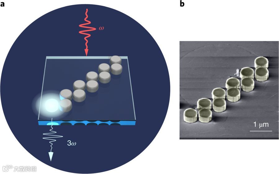 a.Third-harmonic generation (THG)的概念产生于Z字纳米谐振器的拓扑边界态:当以ω频率的光束照射阵列时,其边界位置将产生3ω的非线性光信号。