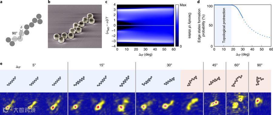 a.Z字角的随机变化-Δφ≤δ≤Δ>φ;b.无序锯齿链状的电镜图像;c.光子DOS与无序参数Δφ的关系 d.边界态的形成与Δφ的关系;e.观察THG在无序Z字形链的分布。