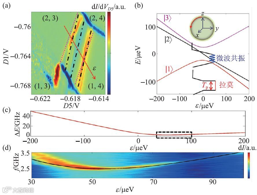 图5 样品能级结构表征(a)双量子点充电蜂窝图。图中两套不同斜率的隧穿线(红色和蓝色虚线)表明系统有两条斜率不同的能级结构;(b)理论计算得到的能级结构图;(c)系统最低两条能级的能级间隔;(d)通过微波共振实验表征出来的能级间隔图。图中黑曲线为理论曲线,对应(c)中黑色虚线区域的能级间隔