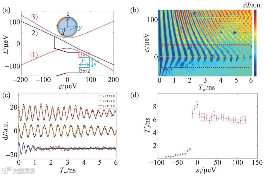 图7 比特绕布洛赫球z轴演化图(a)拉姆齐操控波形示意图;(b)拉姆齐干涉条纹随脉冲宽度和失谐量变化关系图;(c)为(b)中三条虚线对应的振荡曲线;(d)为(b)图中提取出来的相干时间随失谐量关系图