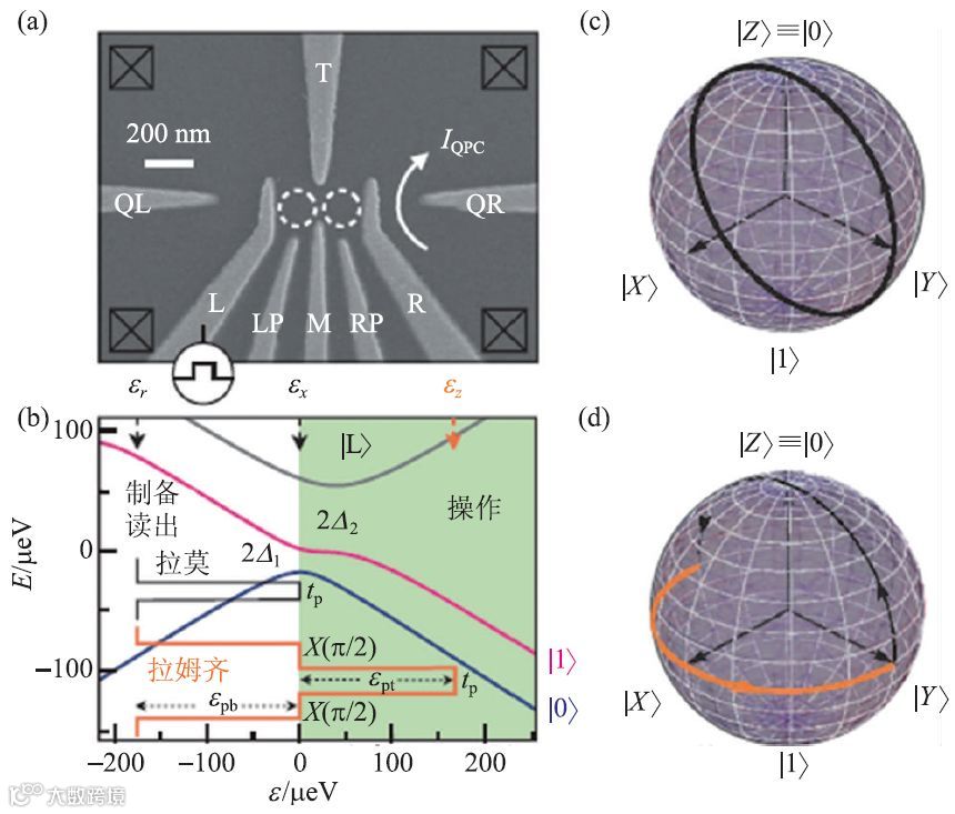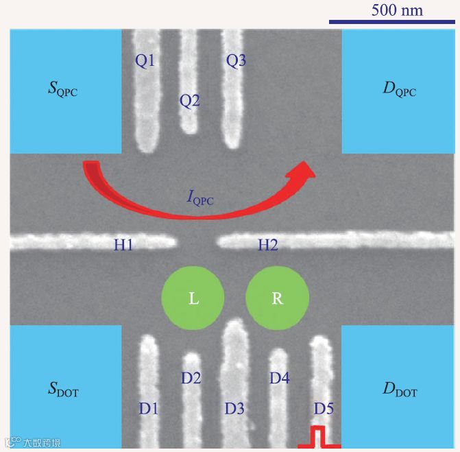 电荷型量子比特则以单个电子在双量子点中的不同位置状态进行编码。图2 是一个双量子点样品在扫描电子显微镜下的照片。可以利用单个电子处在左侧量子点和右侧量子点时,分别定义为|L> 和|R> 来编码量子比特。与自旋型量子比特不同的是,电荷量子比特在|L> 和|R> 间的翻转速度由两量子点间的隧穿耦合决定,其翻转频率可以非常快(~5 GHz)。但是因为与环境噪声耦合强,电荷型量子比特相干时间却一般较短(~2 ns)。在这么短的相干时间内完成一系列的高保真度门操控是电荷量子比特实现量子计算的最大挑战。由于电荷量子比特相干时间短,自旋量子比特操控速度慢,因此寻找快操控、长相干兼容的编码方式,在比特相干时间内尽可能多地完成量子操控便成为学术界关心的重要课题。