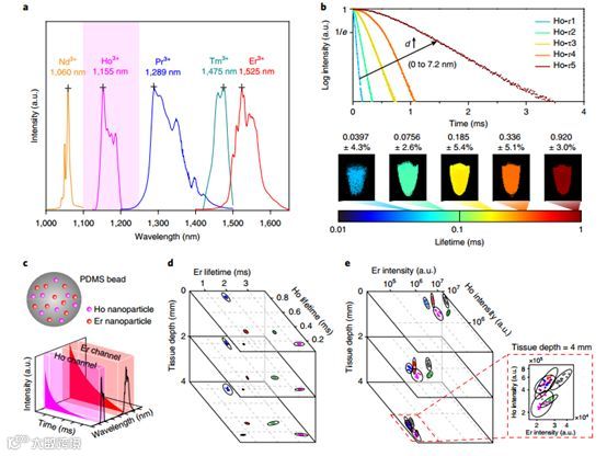 e,通过时间分辨NIR-II成像系统获得的Er纳米颗粒的伪彩色映射寿命图像。