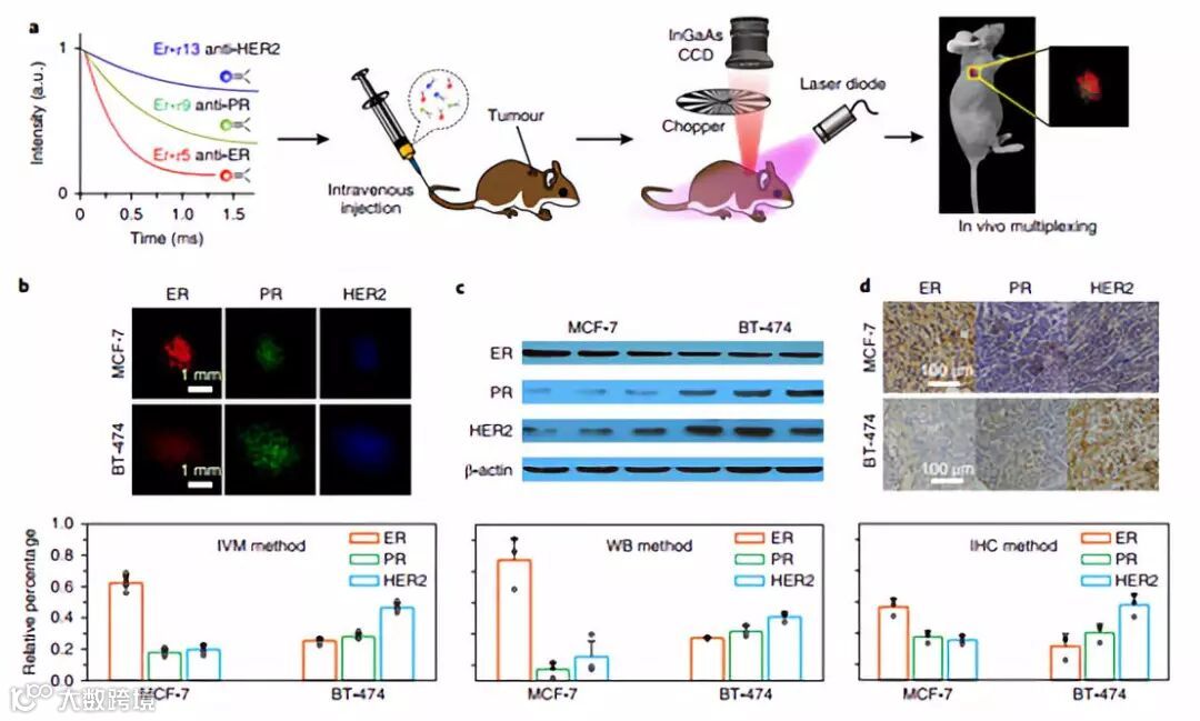 c-d,体外蛋白质(c)和体内免疫组织化学分析(d)结果,计算的两种肿瘤亚型的生物标志物。