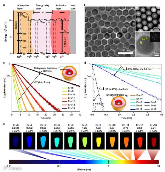 a,“核-多壳”纳米颗粒发光过程的能级图;