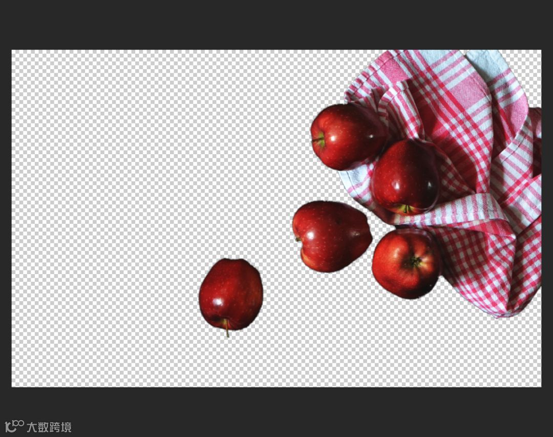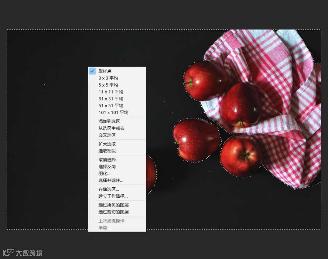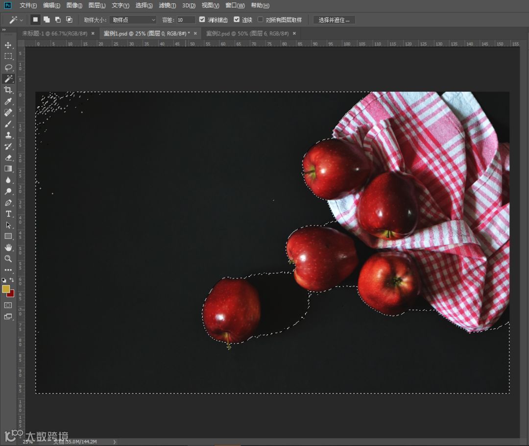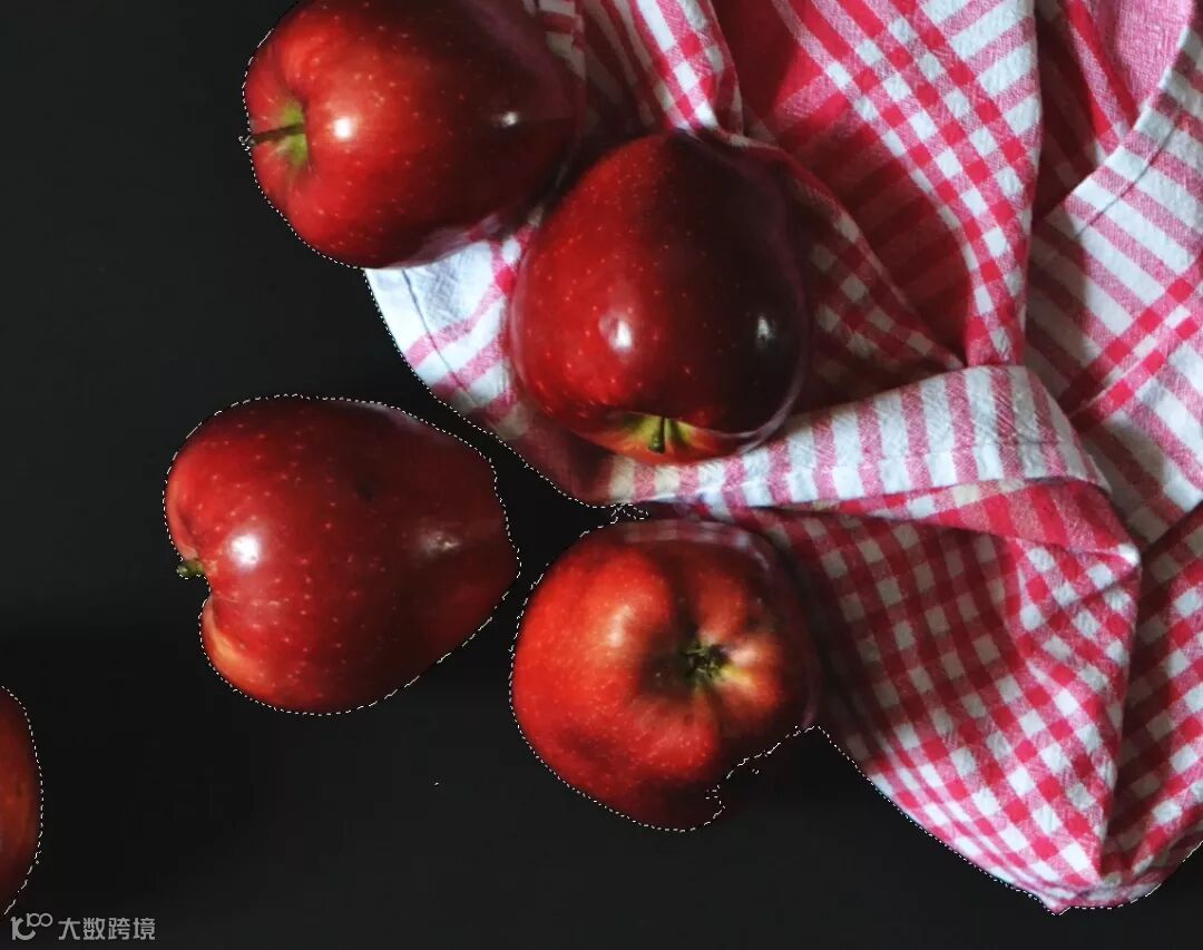 我们会发现选的范围特别大,包括苹果深色的地方也给选上了。而当我们把容差改为10,ps识别能力增强了,选的区域不够大。如下图所示: