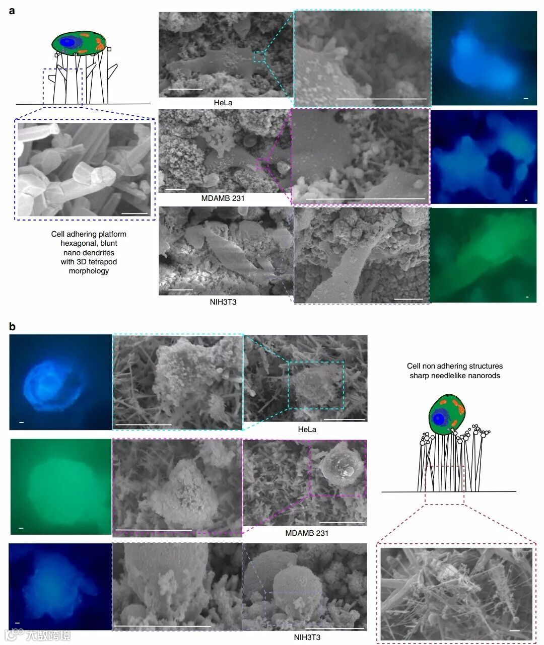 (b)尖锐的针状纳米树突基底不能实现细胞粘附。