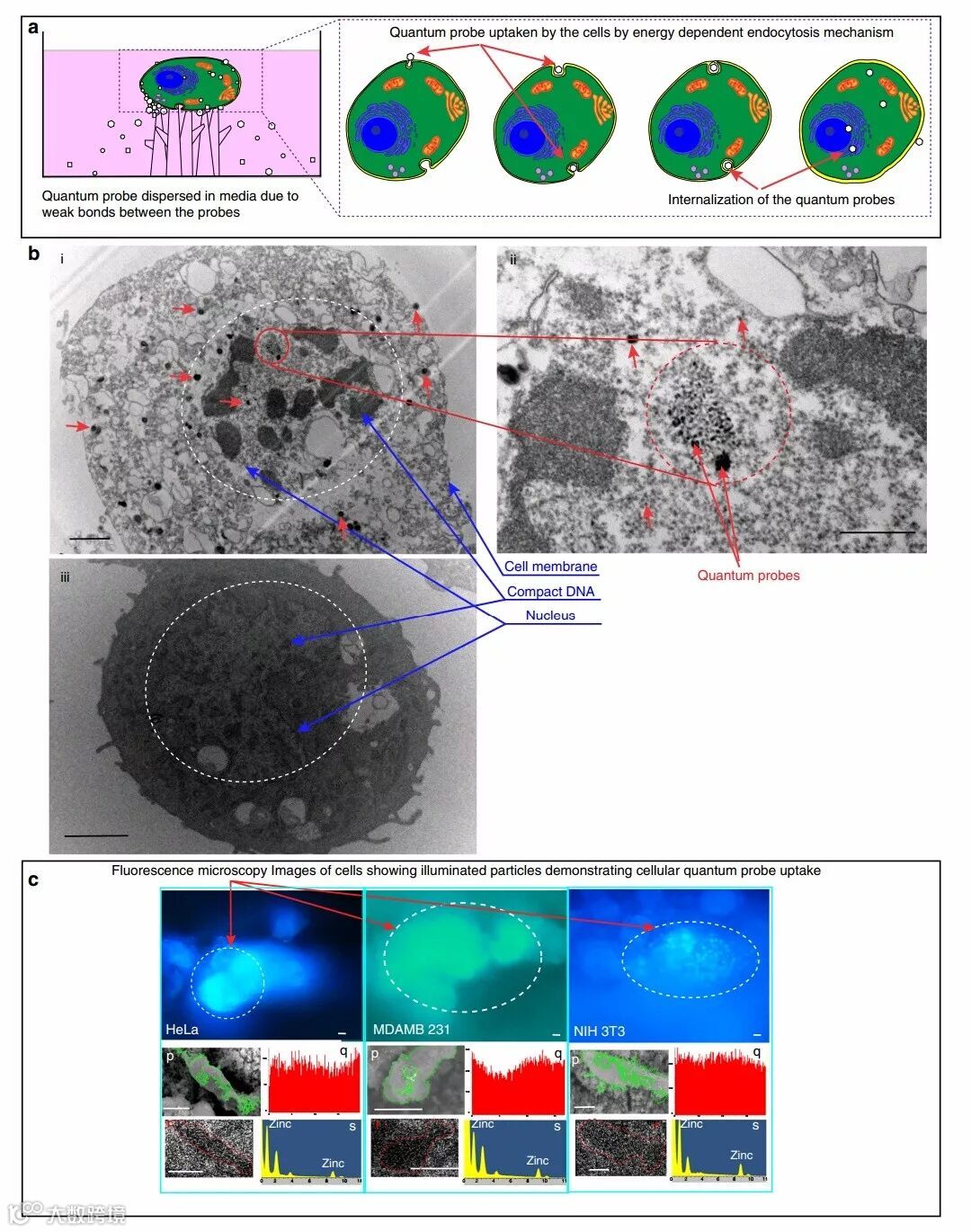 (a)细胞吸收和量子探针内部化的细胞TEM图;